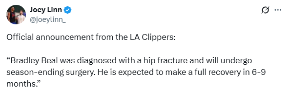 快船官方宣布,布拉德利-比尔的伤情确诊为髋部骨折,他将接受手术并且确定赛季报销,预计休养6-9个月能够完全康复。