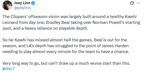 快船随队记者Joey Linn发推写道:快船在休赛期的建队蓝图,原本完全建立在三大支柱之上,开赛即拥有健康的莱昂纳德、由比尔顶替鲍威尔进入首发以及深厚的轮换阵容。然而赛季至今,现实与愿景相去甚远,莱昂纳德缺席了近半比赛,比尔赛季报销,而球队的阵容深度也捉襟见肘,以至于哈登几乎需要打满全场,球队才有一线胜机。常规赛征程漫漫长路,但眼下这般开局,已然糟糕得超乎想象。